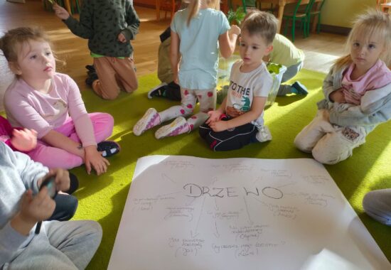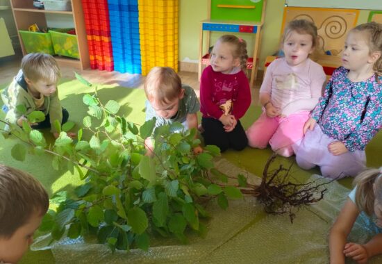 – Rozpoczęliśmy projekt „Drzewo”- poszerzaliśmy naszą wiedzę o drzewach (w szczególności o częściach drzewa i ich funkcjach), Wzbogacaliśmy słownik o pojęcia związane z drzewem. Kształtowaliśmy postawy szacunku wobec roślin i zwierząt.