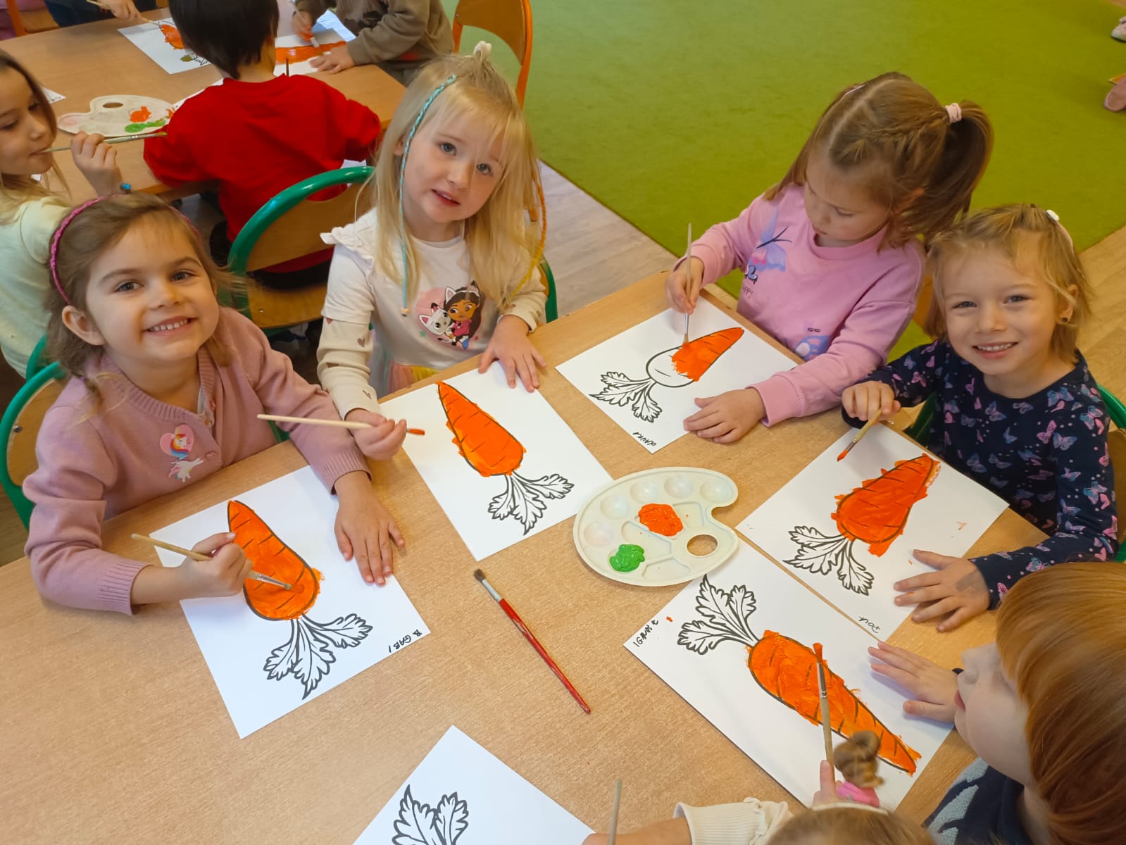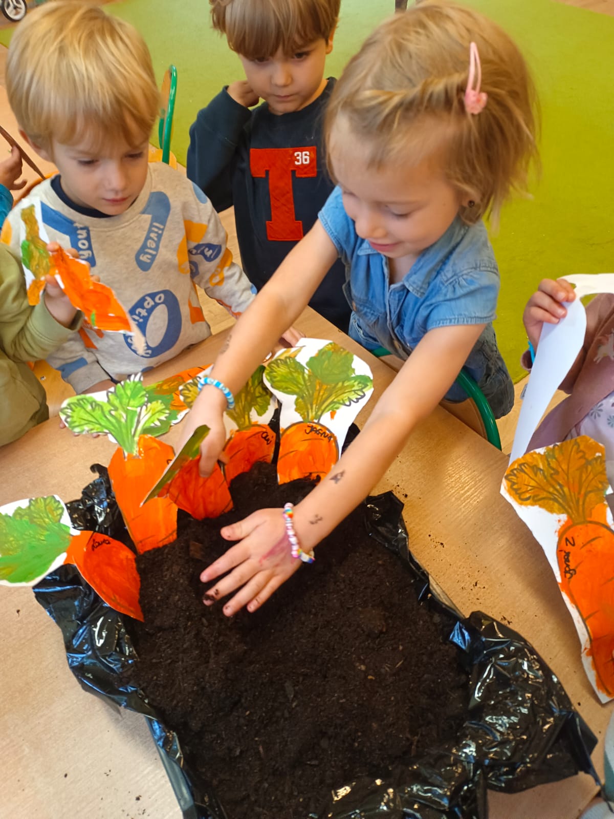-określaliśmy położenie warzyw- dowiedzieliśmy się co rośnie nad i pod ziemią -wykonaliśmy pracę przestrzenią pt „nad i pod ziemią-” „Marchewka”,