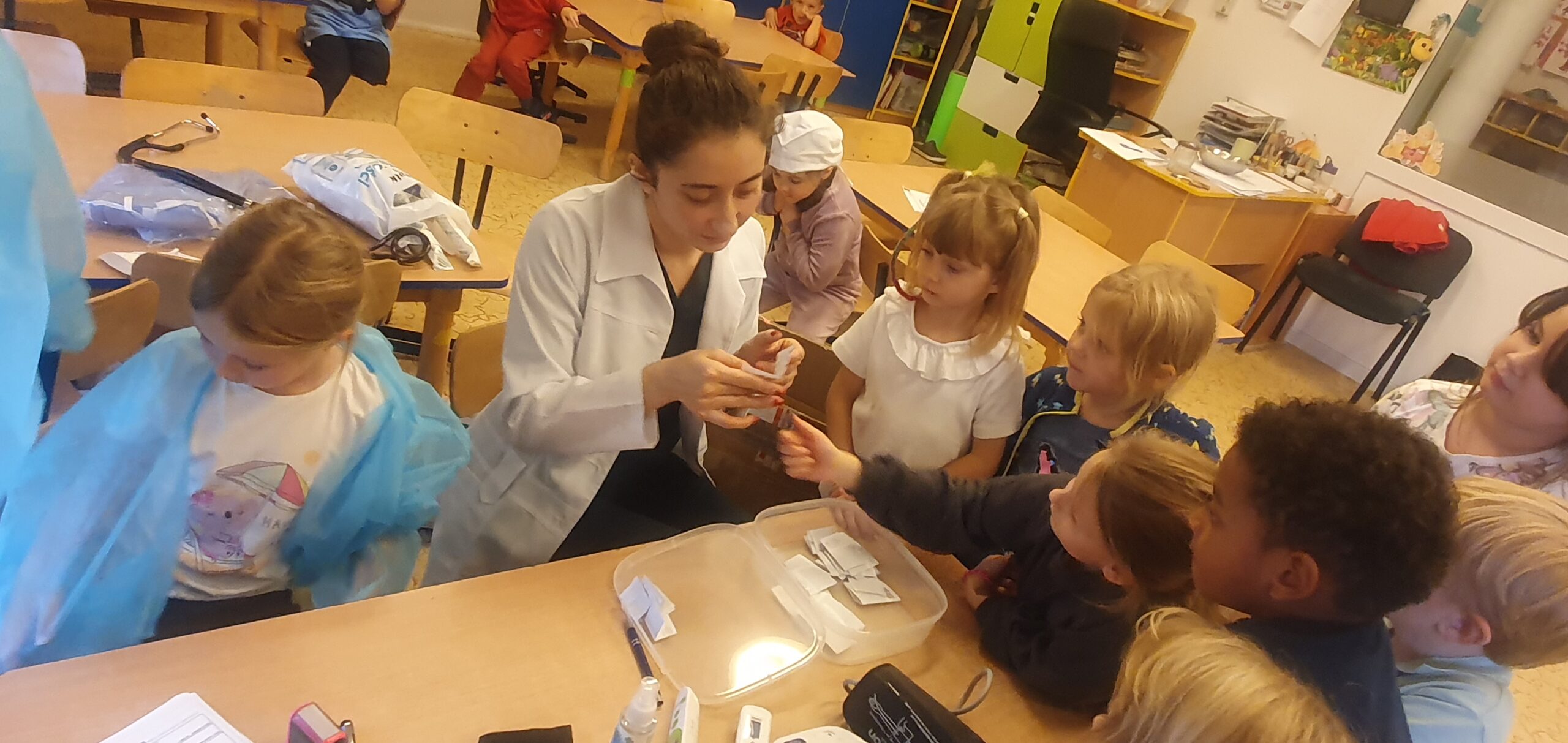 Nasz gość zapoznał nas z zawodem lekarza ,który jest bardzo ważny a jego praca nie należy do łatwych.Dowiedziliśmy się z jakich organów składa się ciało człowieka od wewnątrz.Mogliśmy wcielić się w rolę lekarza i pacjenta ,wypisywać recepty i przymierzyć prawdziwy fartuch lekarski !Poznaliśmy niezbędnik lekarski czyli zestaw akcesoriów potrzebych lekarzom do pracy.