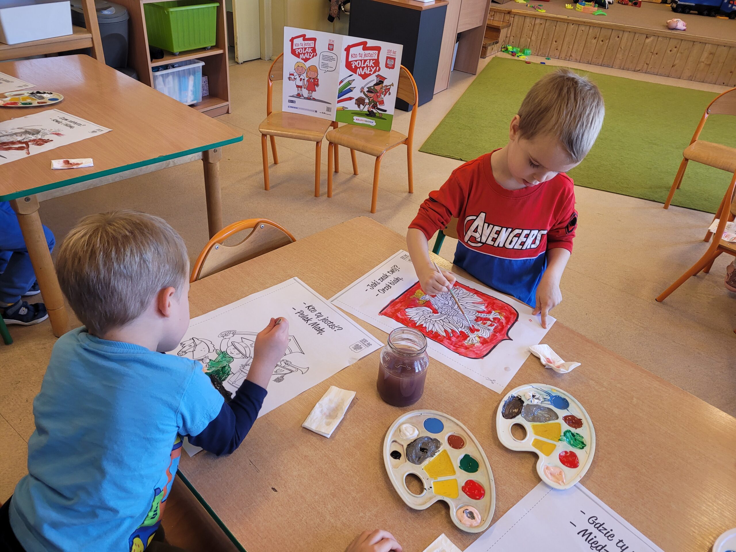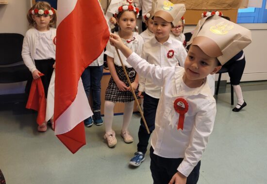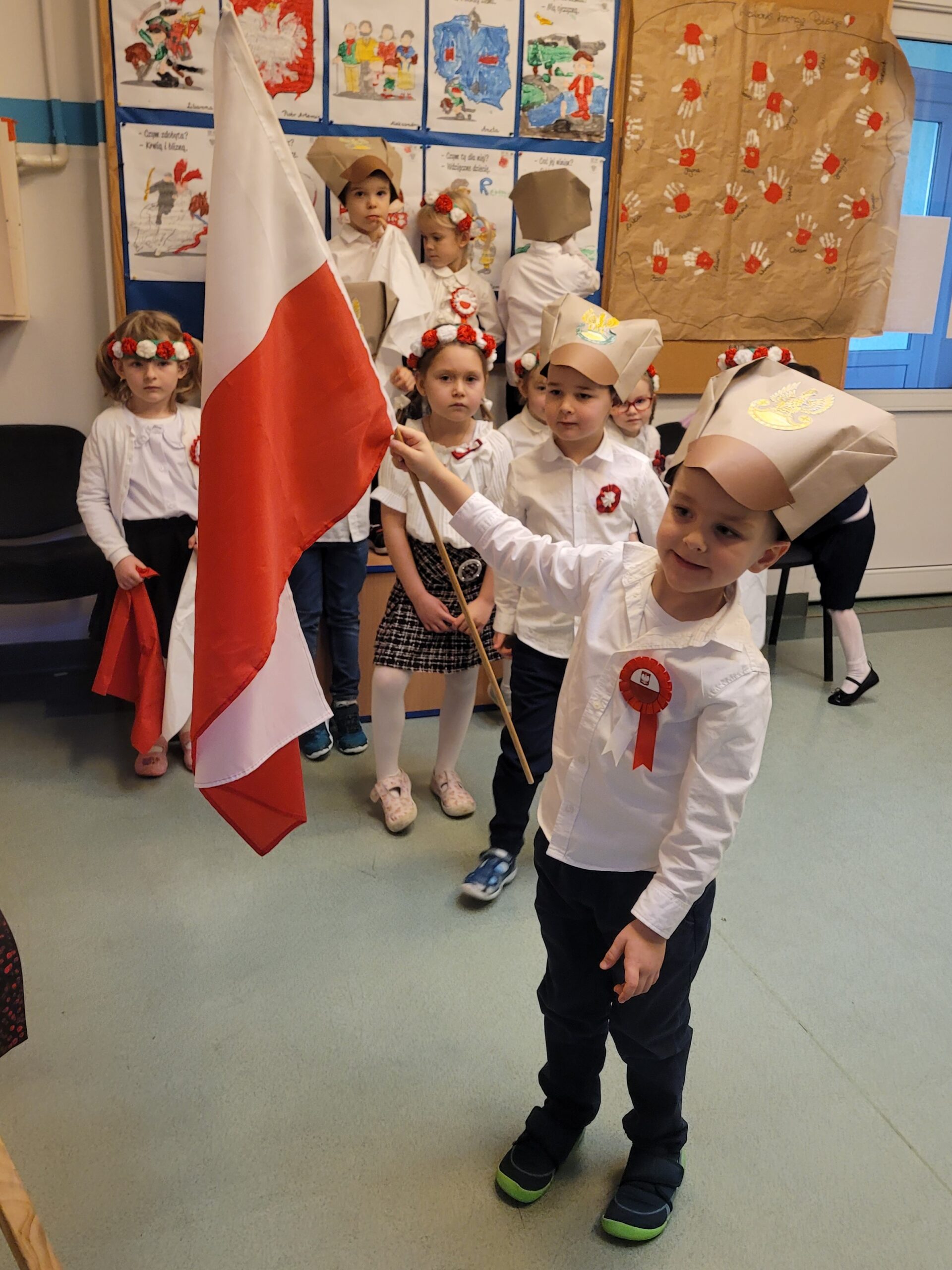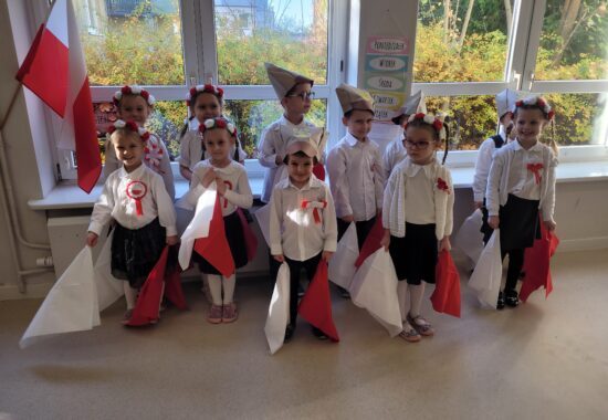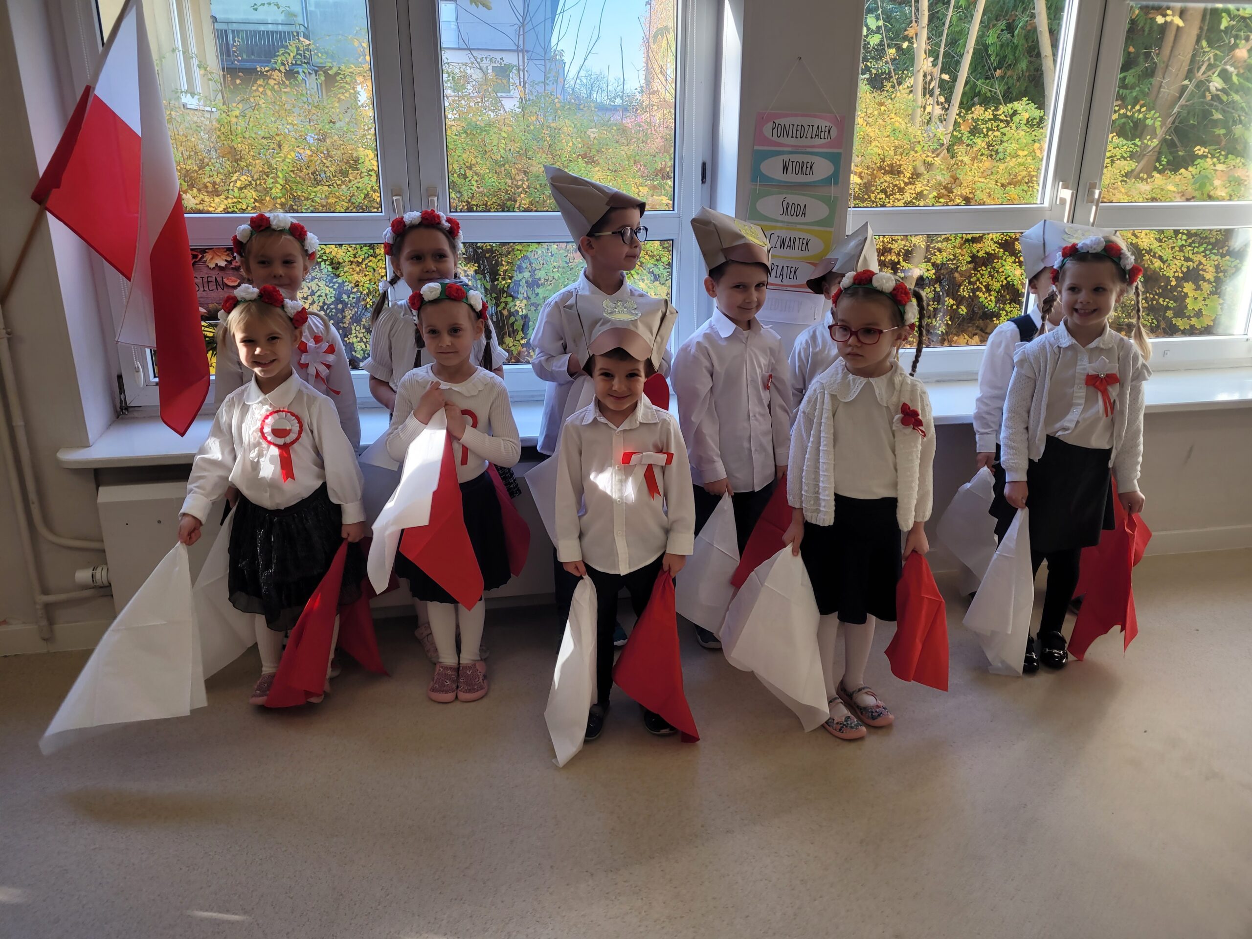 Przez ostanie dwa tygodnie dzieci utrwalały wiedzę dotyczącą symboli narodowych. Oglądały filmy dotyczące historii Polski oraz słuchały opowieści z nią związanych. Śpiewały piosenki związane z niepodległością i pięknem naszego kraju. Przedszkolaki wykonywały prace plastyczne związane z symbolami narodowymi oraz drogą do niepodległości naszej ojczyzny. W piątek, przed Narodowym Świętem Niepodległości odbył się w naszym przedszkolu uroczysty apel. Dzieci odśpiewały hymn państwowy, recytowały wiersz Władysława Bełzy „Katechizm polskiego dziecka” oraz śpiewały piosenki patriotyczne. W tym dniu zostały pasowane na przedszkolaka dzieci, które wcześniej nie mogły uczestniczyć w tym wydarzeniu. Na zakończenie uroczystości dzieci odśpiewały hymn przedszkola.