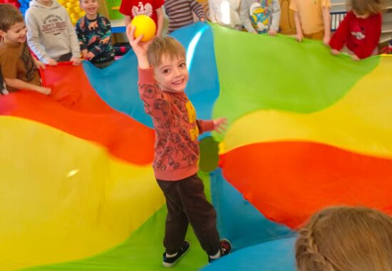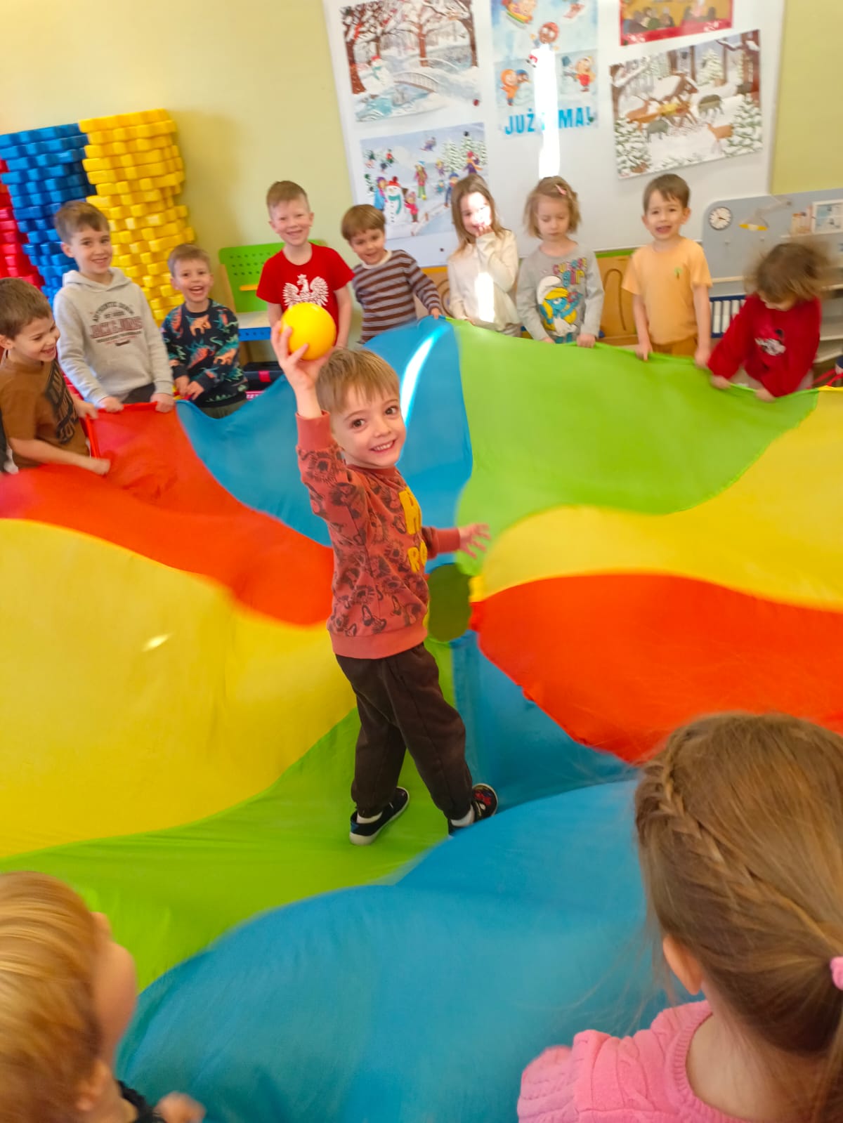 Dużo radości sprawiły dzieciom zabawy z chustą animacyjną Klanzy, które integrowały grupę oraz rozwijały koordynację ruchową.